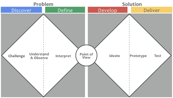 The Design Thinking framework begins with the so-called “problem/challenge statement.” This refers to the Double Diamond model developed by IDEO, a design company closely associated with Stanford University’s d.School.